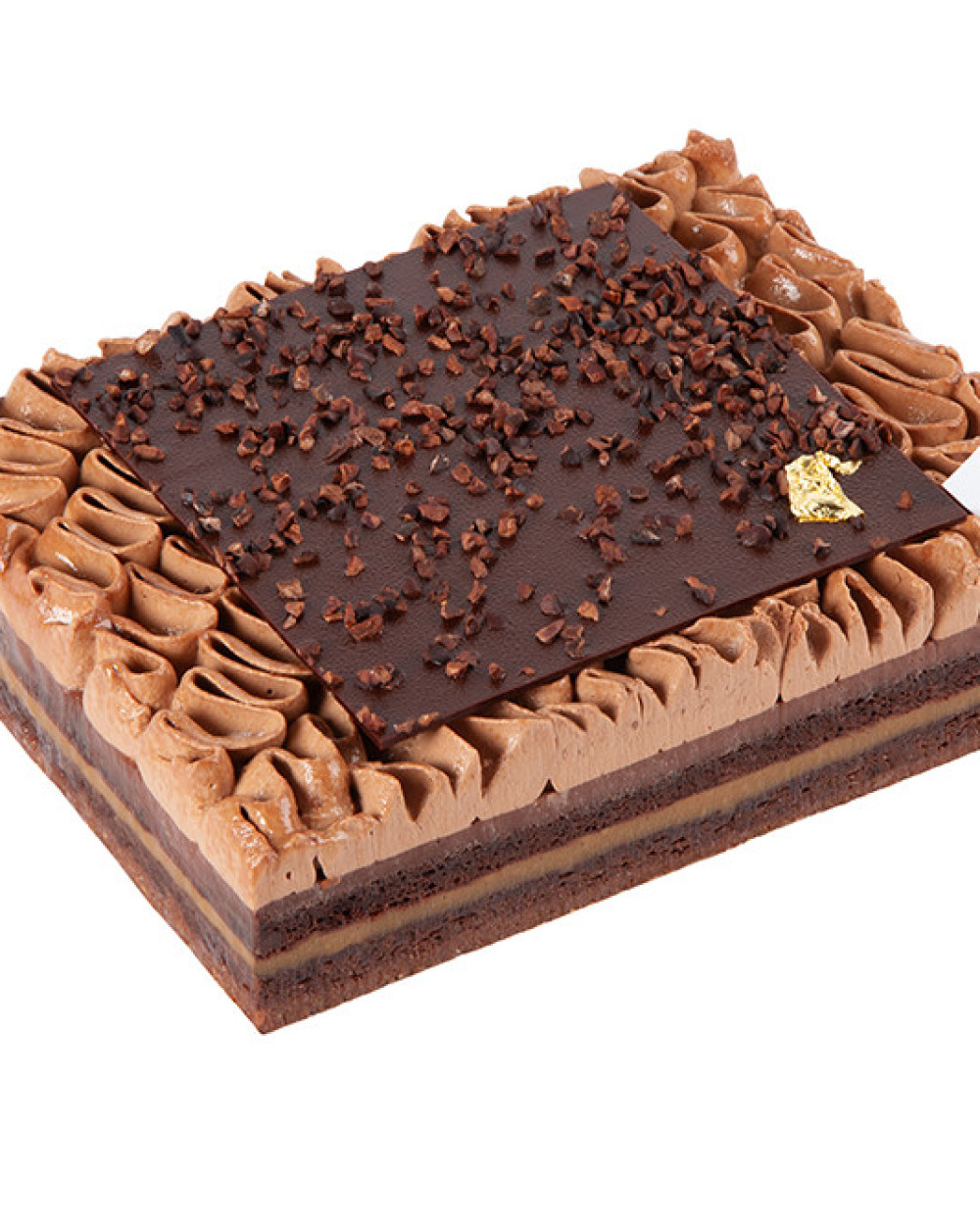 Sablé croustillant et biscuit moelleux au chocolat noir, caramel tendre, crémeux et ganache montée au chocolat noir.