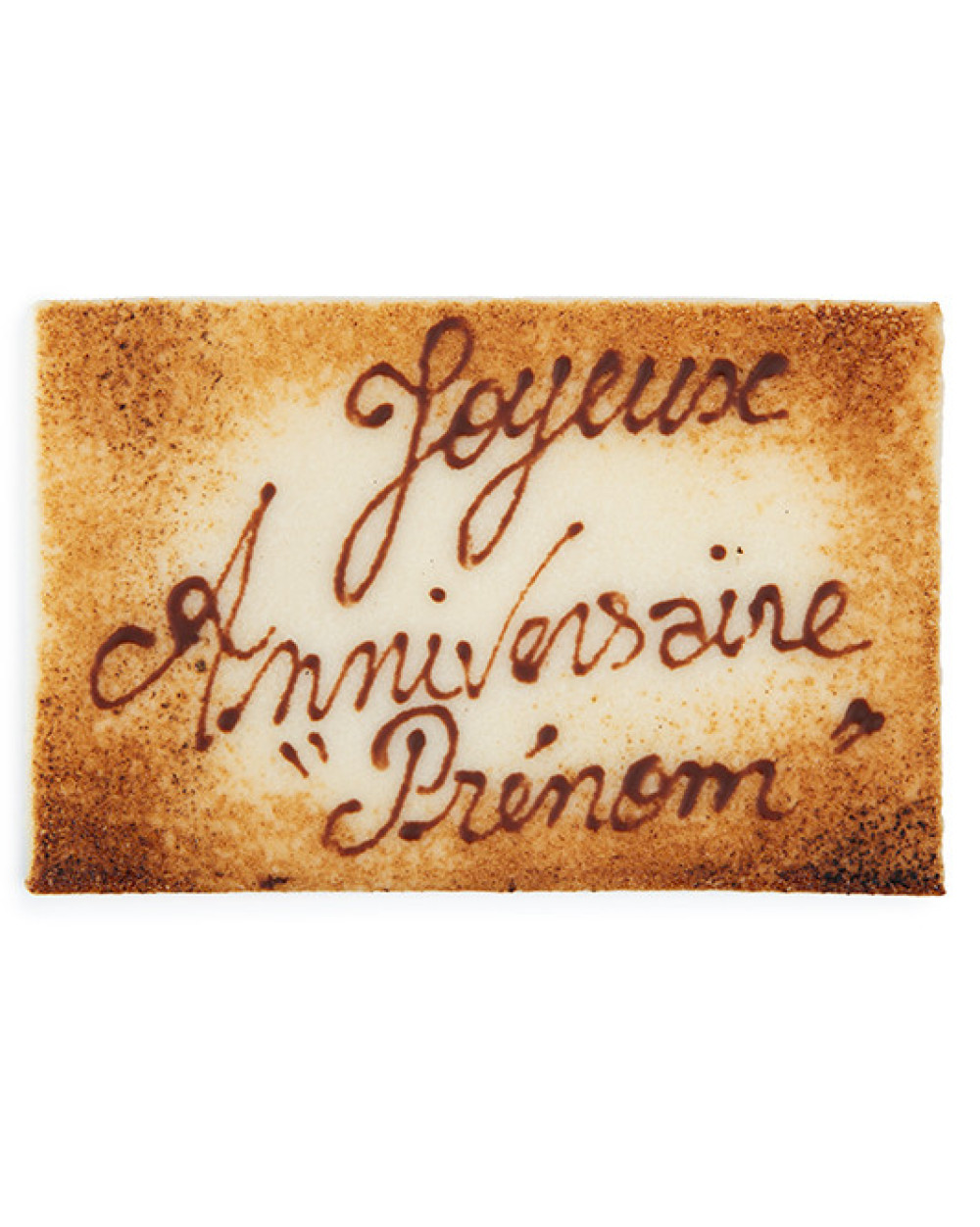 Pour toute commande de pâtisserie à partager (4 ou 6 parts), profitez d’une plaque personnalisée en pâte d’amande pour célébrer tous vos événements (Anniversaire, Mariage, Baptême…).