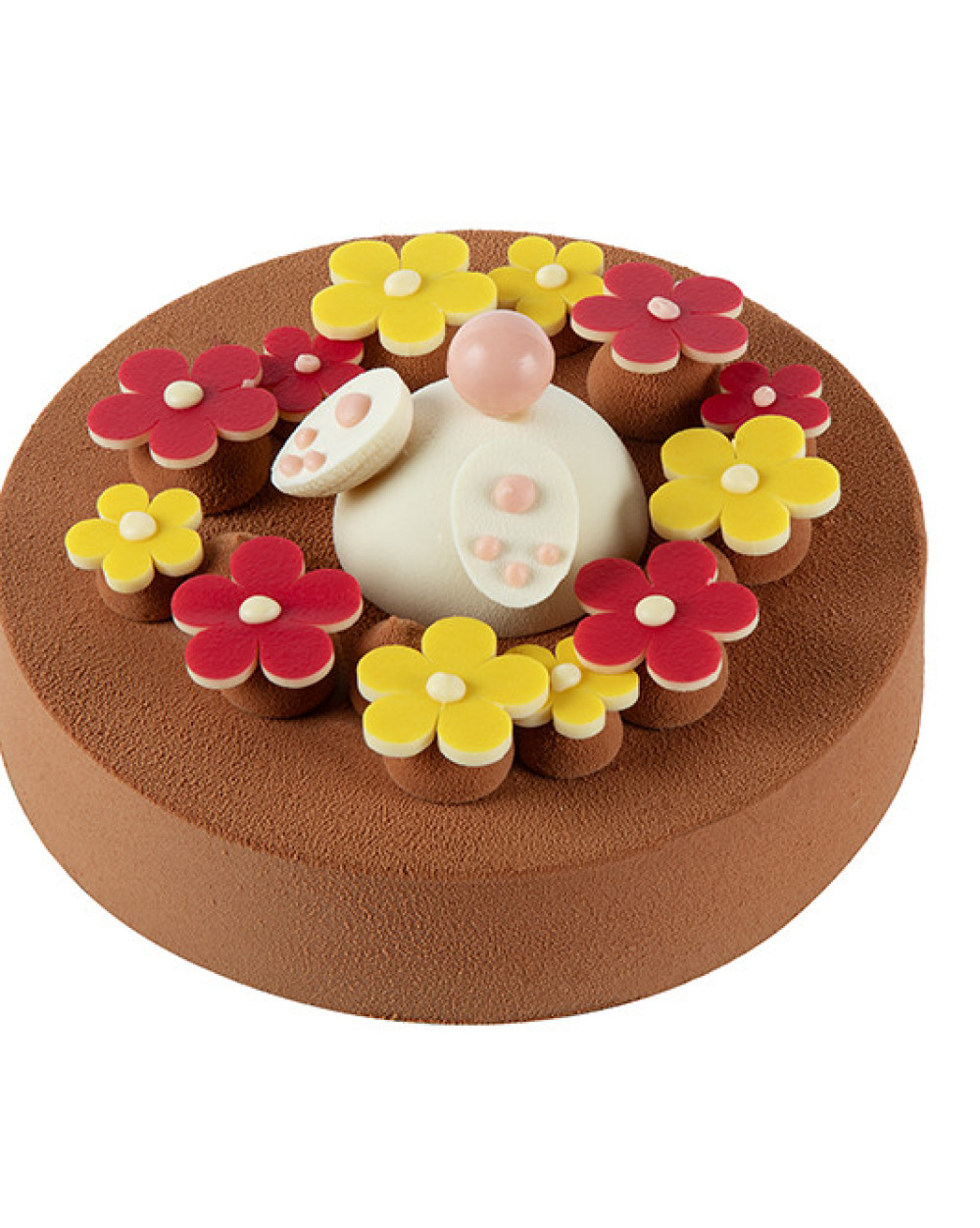 Taille Unique 6 parts - Disponible les 3, 4 et 5 avril. Biscuit moelleux au chocolat noir, croustillant praliné, crémeux vanille onctueux, cœur praliné coulant et mousse légère au chocolat noir 65% du Venezuela.