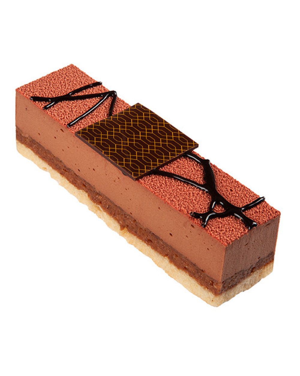 Mousse au chocolat noir, praliné croustillant noisette sur biscuit amande