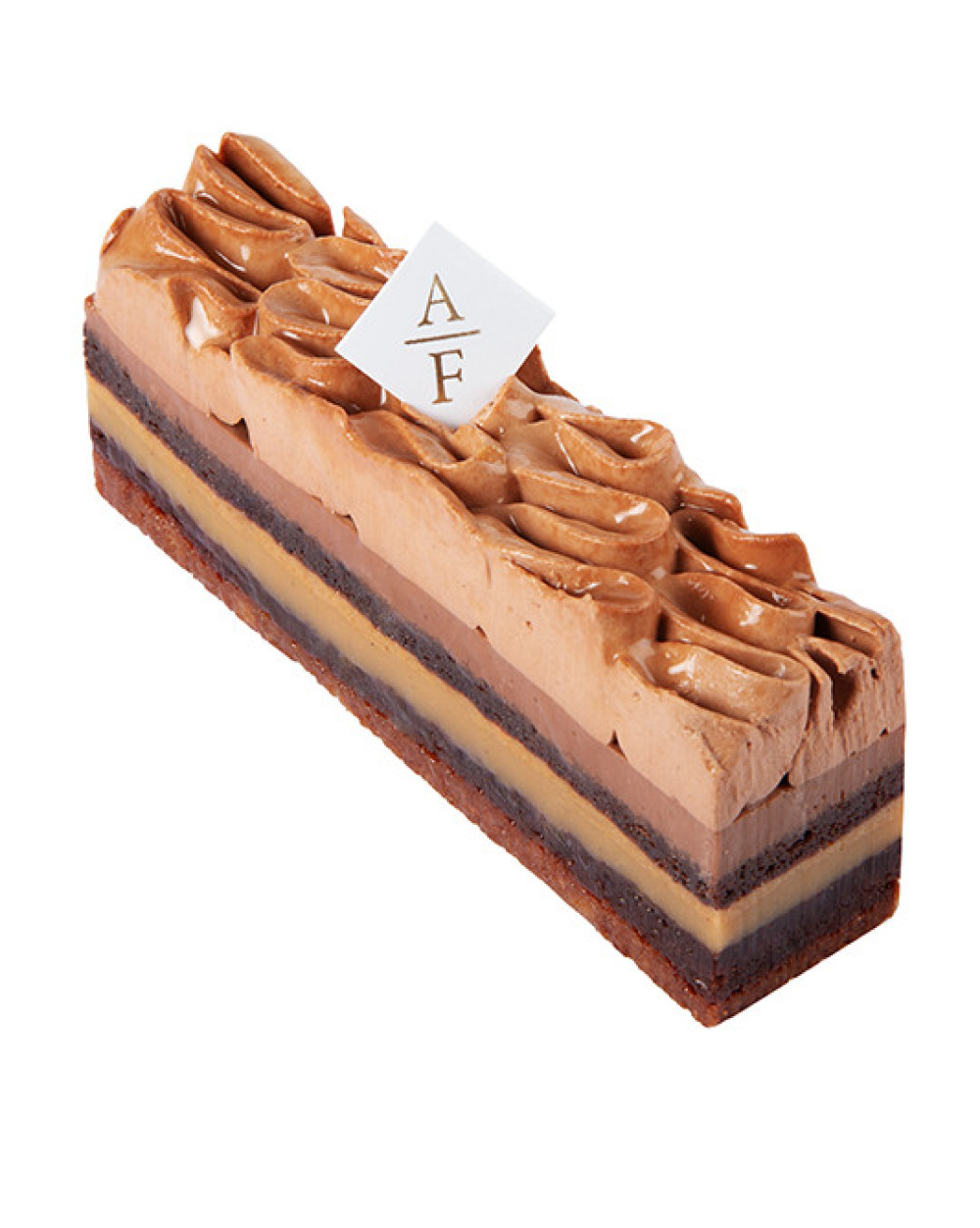 Sablé croustillant et biscuit moelleux au chocolat noir, caramel tendre, crémeux et ganache montée au chocolat noir.