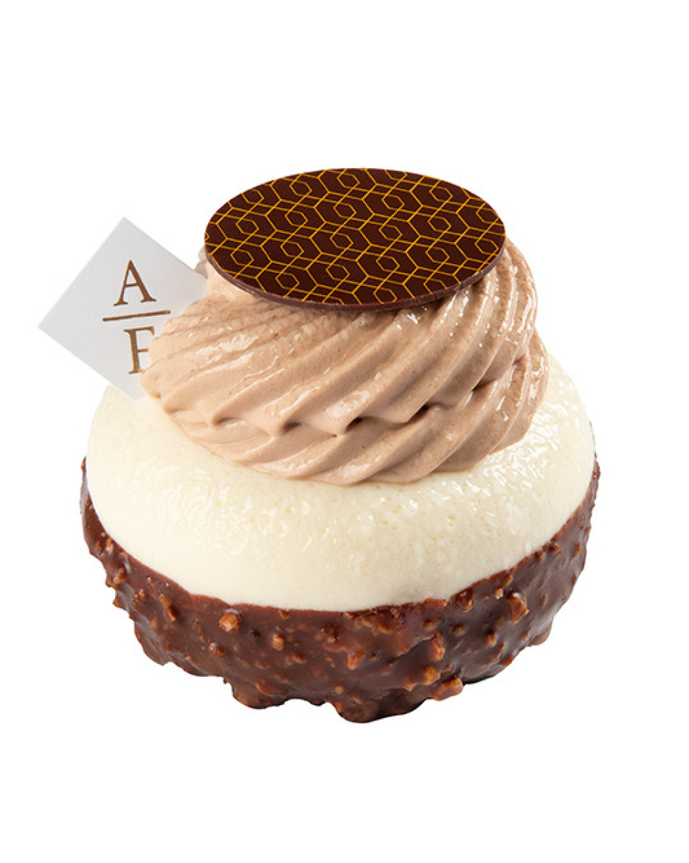 Sablé croustillant, ganache chocolat noir, biscuit moelleux chocolat, mousse mascarpone au café et ganache montée lactée café.