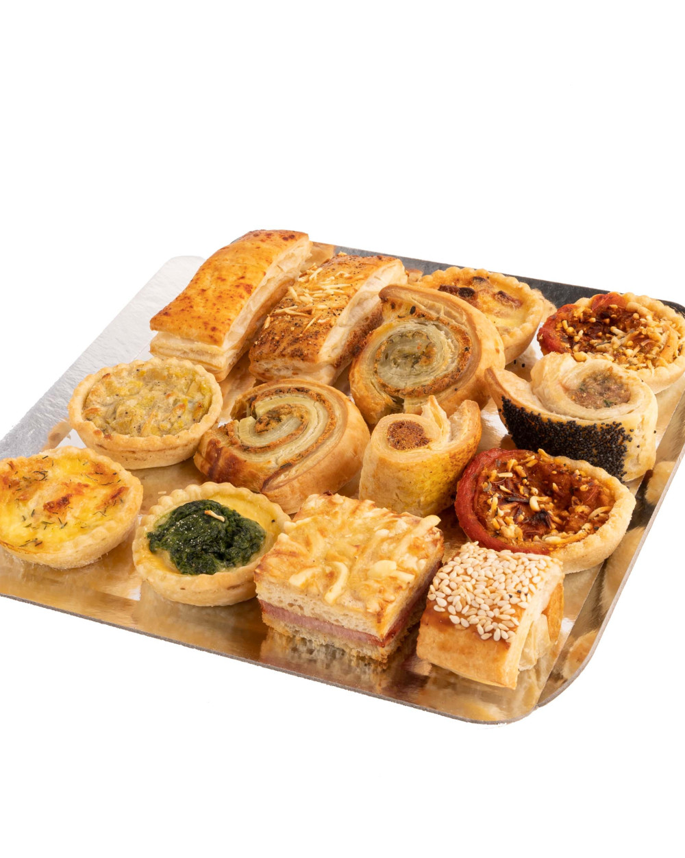 Feuilleté saumon, roulé saucisse Toulouse, roulé saucisse Strasbourg, allumette fromage, mini croque-monsieur, mini quiche lorraine, mini pizza, mini tarte chèvre épinard, mini tarte poireaux.
