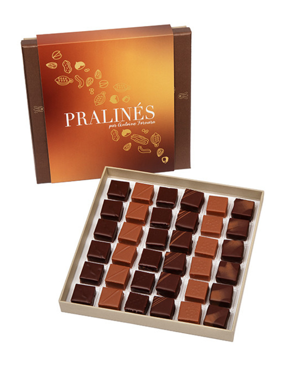 Ce coffret signature est le fruit d’une recherche inspirée autour du praliné. Le praliné - ou plutôt les pralinés - ouvrent de vastes horizons créatifs par la richesse et la diversité du travail réalisé à base de fruits secs. Nous les avons explorés pour vous les faire partager. Une découverte gustative qui vous emmène dans des contrées gourmandes et raffinées. Suivez le parcours de dégustation en 6 étapes pour en apprécier toutes les nuances. 6 sortes : Turron, Piémont, Toscane, Sichouan, Pinotte, Maracaibo