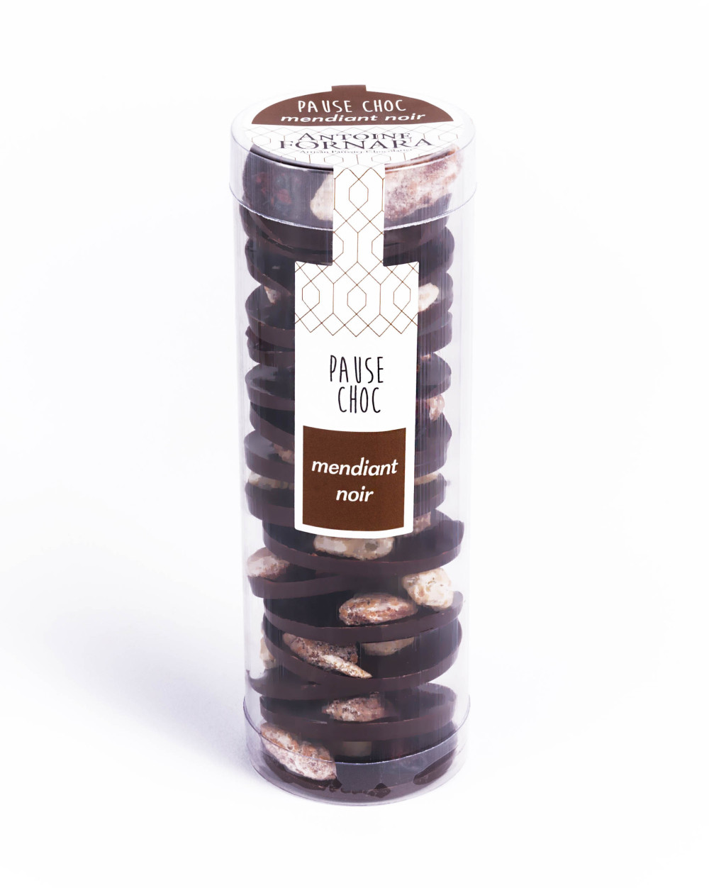 Palets de chocolat noir, amandes et pistaches caramélisées, cranberries