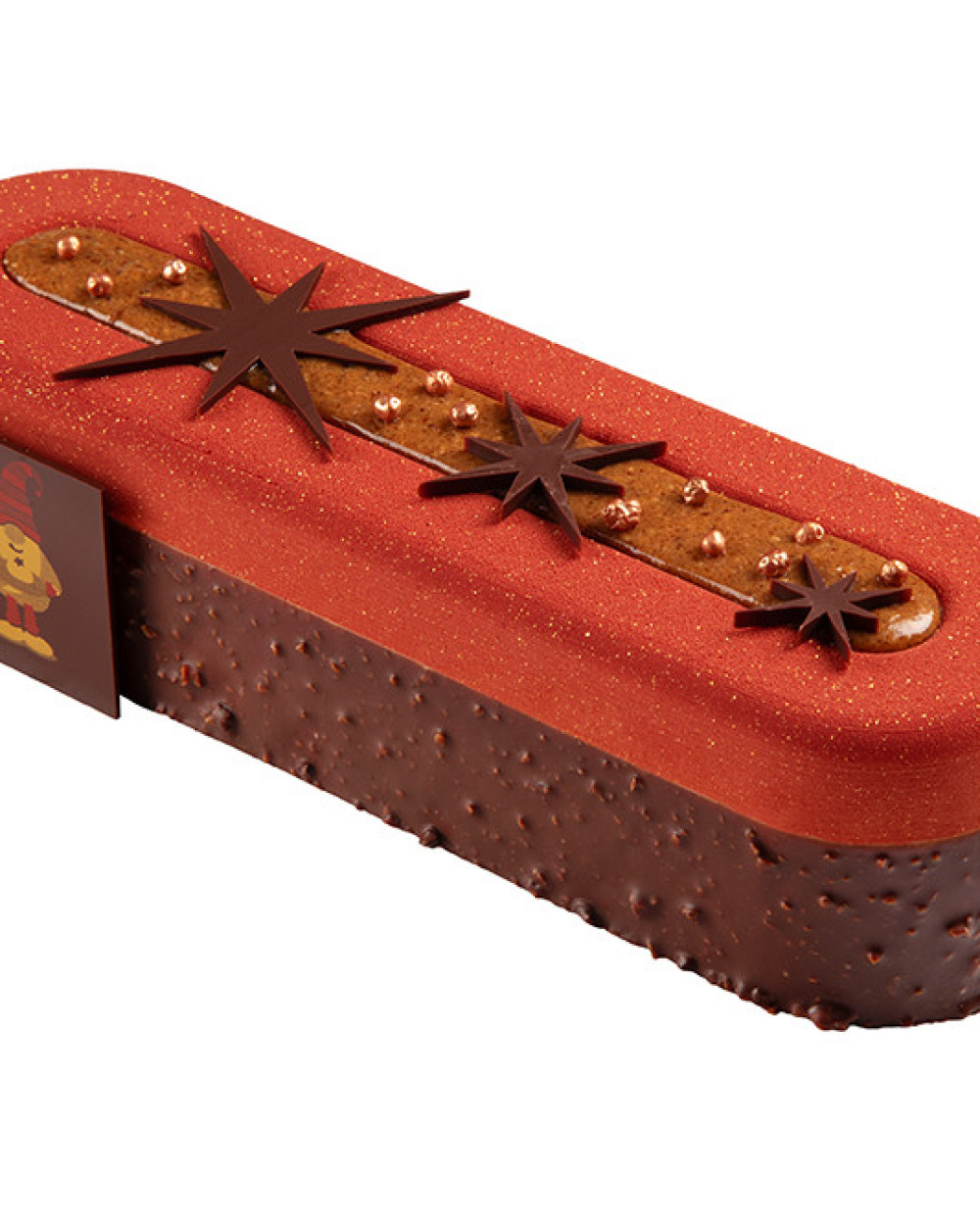Sablé praliné croustillant, biscuit amande, crémeux vanille grillée, mousse chocolat noir 65%. Une bûche intense et raffinée, tout en contraste et en gourmandise