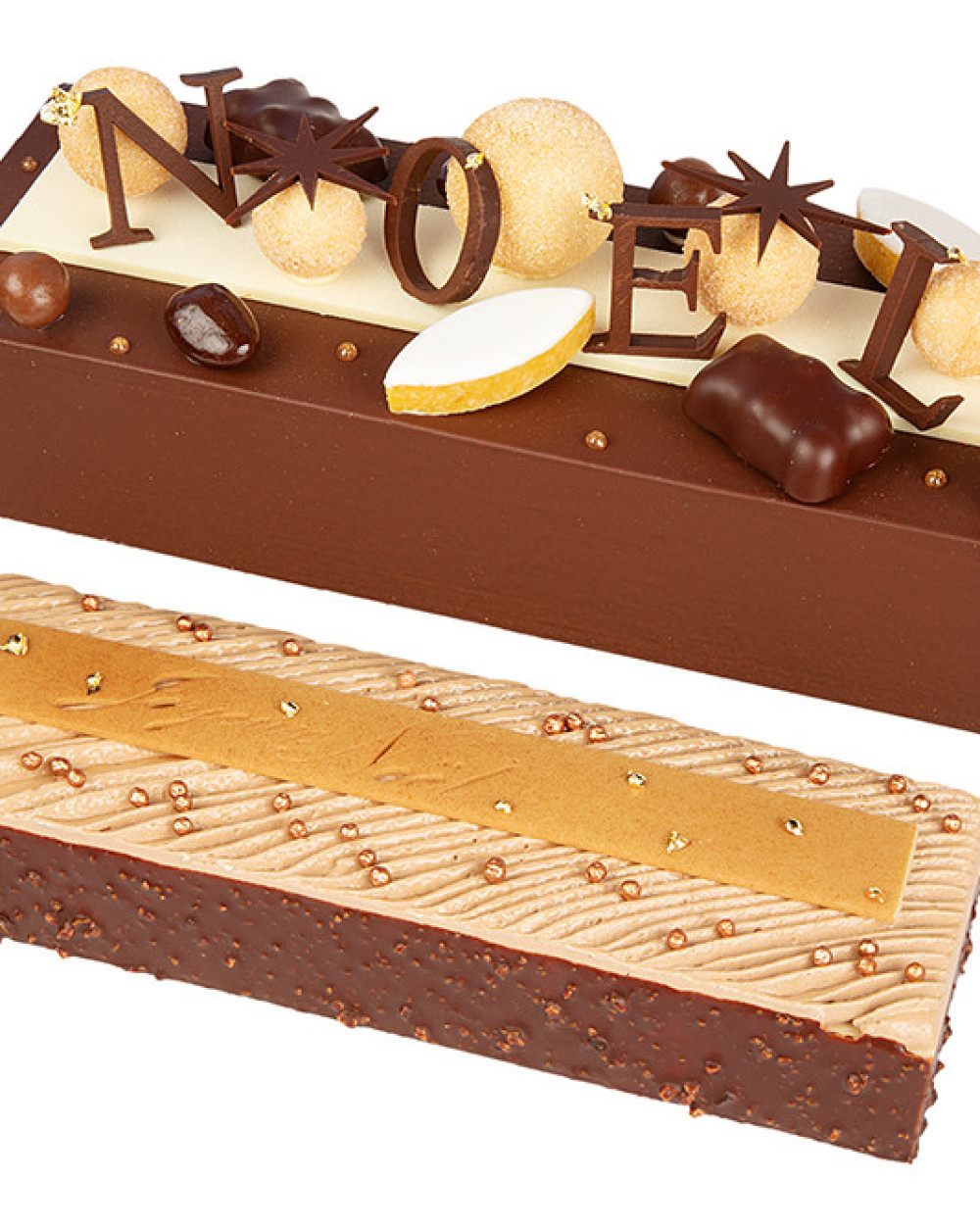 Sablé aux épices de Noël, biscuit moelleux au chocolat et ganache du Venezuela 65 %, relevés d’une marmelade d’orange et d’une mousse lactée légère. Un équilibre subtil entre intensité et douceur. Accompagné de sa sculpture chocolatée et de ses friandises de fin d’année (600g)