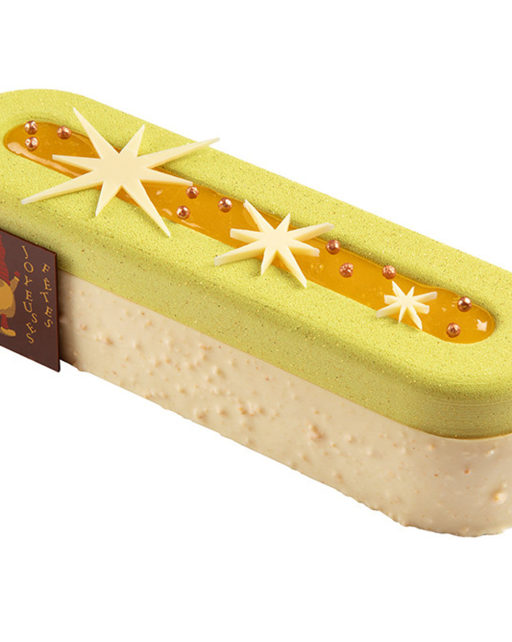 Sablé croustillant coco, biscuit amande, confit mangue-vanille, crémeux exotique, crème mascarpone vanille-citron vert. Une explosion de saveurs tropicales pour des fêtes ensoleillées.
