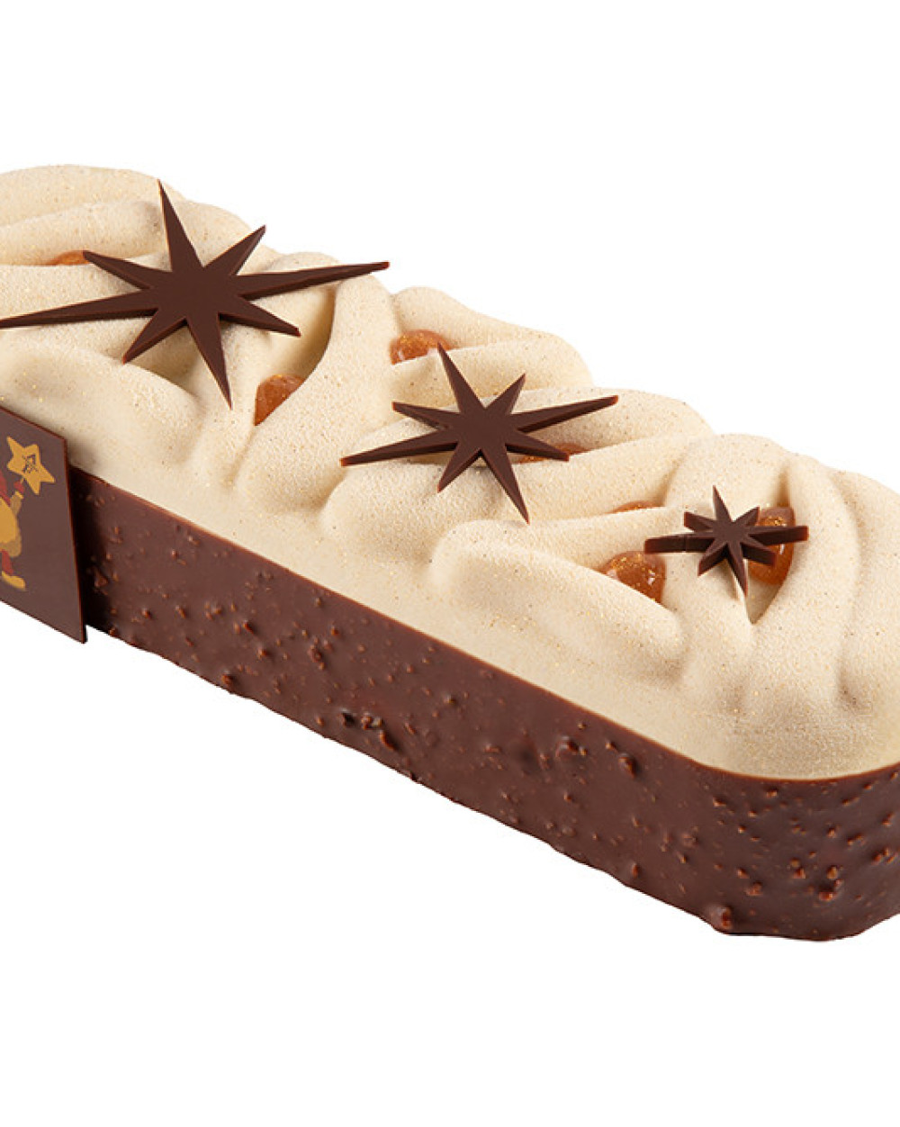 Sablé croustillant grué, biscuit chocolat, confit poire-vanille, crémeux marron aux éclats de marrons glacés, mousse de marron. Une harmonie gourmande entre chocolat, poire et douceur automnale.