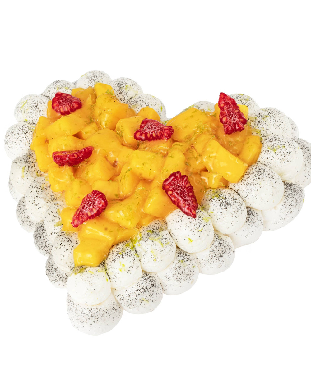 Taille Unique 2/3 parts - Meringue craquante, chantilly à la vanille de Madagascar, crémeux citron vert et mangues fraîches.