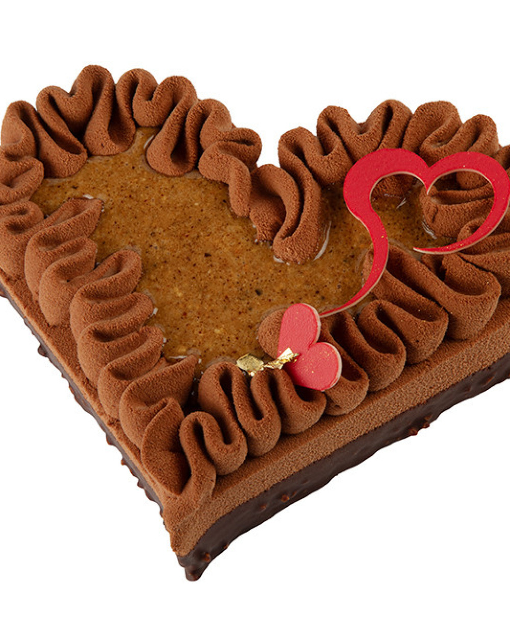 Taille Unique - 2/3 parts - Sablé croustillant, biscuit amande, mousse au chocolat noir et coeur de praliné noisette coulant.