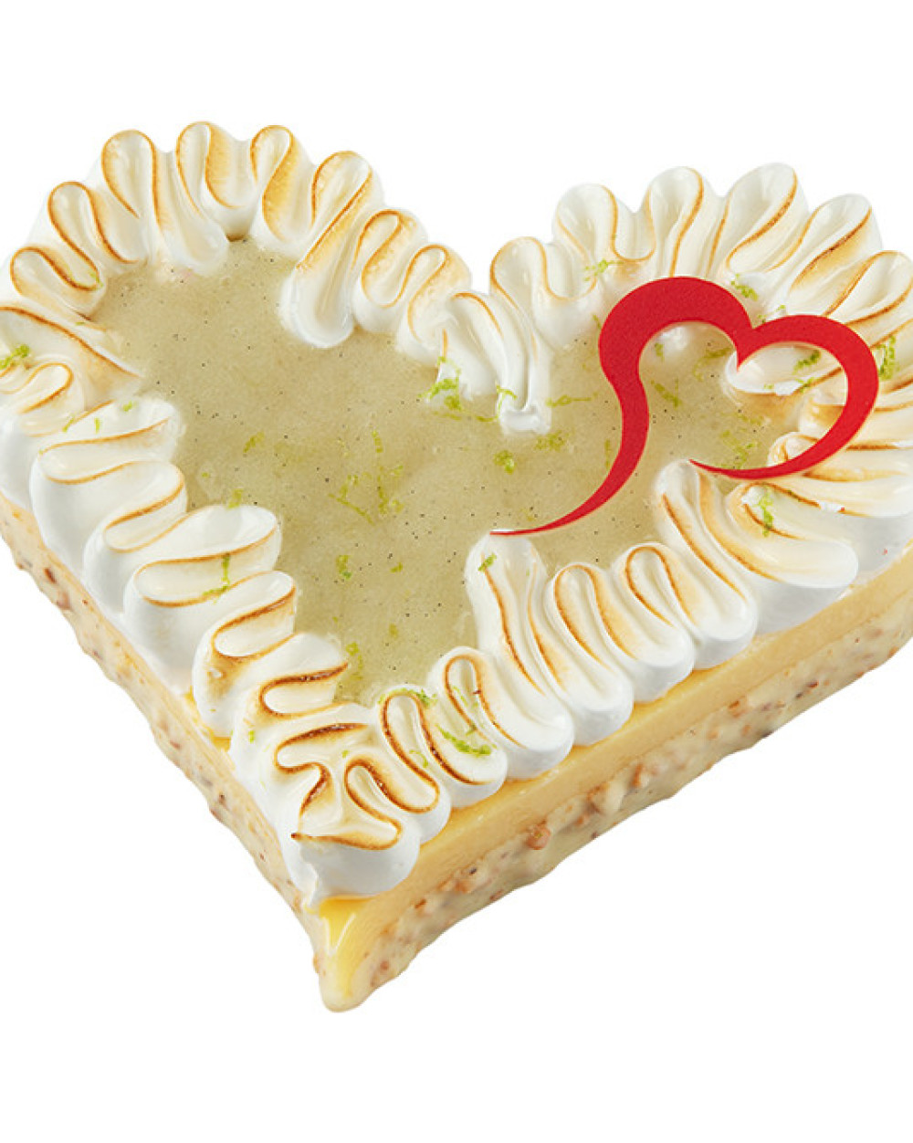 Sablé croustillant, biscuit moelleux à l'amande, crémeux citron jaune, meringue fondante et coulis citron vert.