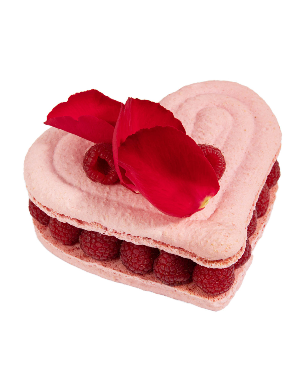 Biscuit Macaron, crème à la rose, litchis et framboises fraîches.